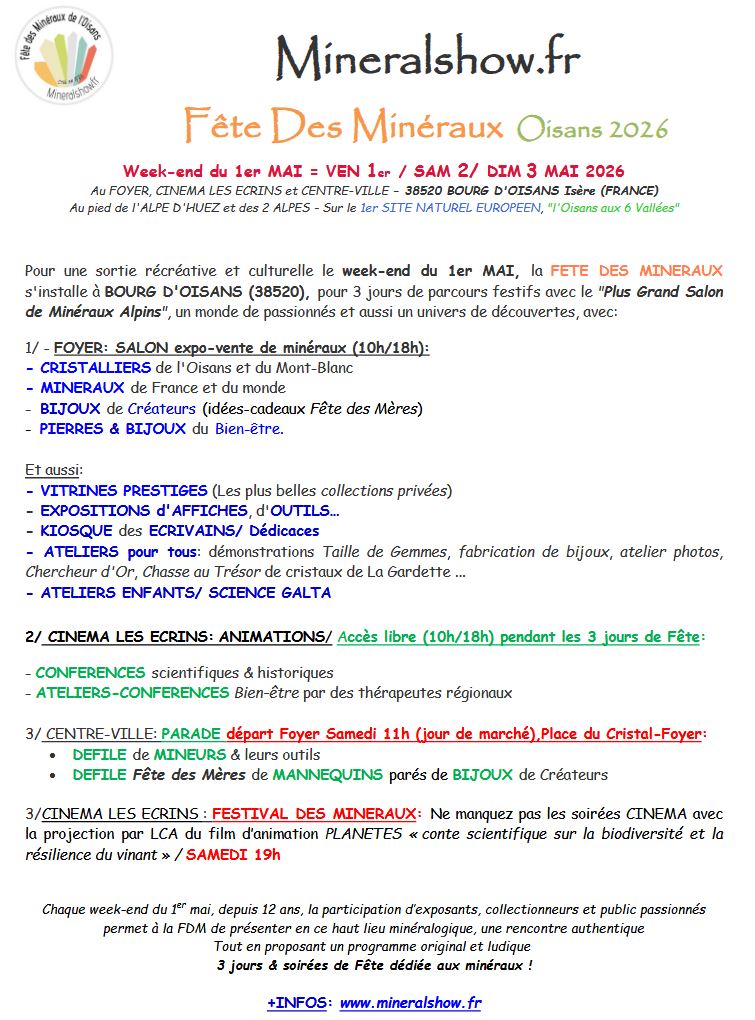 Évènements 2026 PROGRAMME 2026 FDM EDITION 2026 FOYER: Salon des Minéraux / EXPOS-VENTE (10h /18h) Vitrines prestiges, cristalliers, bijoux de créateurs, bien-être, affiches, ateliers enfants…& Animations, défilé (départ foyer SAM 11h puis centre-ville, retour suivi d’un concert) CINEMA LES ECRINS: Festival des Minéraux/ Film en soirées SAM 19h: Film d’animation PLANETES « Conte scientifique sur la biodiversité et la résilience du vivant » + d’infos: programmation FDM par LCA/ cinebourgdoisans.com Le MUSEE DES MINERAUX, le nouveau GALTA galerie entièrement rénovée a repris sa place au dessus de l’église Le plus grand salon de Minéraux Alpins ! Bourg d’Oisans 38520 (ISERE) FRANCE Au pied de l’Alpe d’Huez et des 2 Alpes – 1er SITE NATUREL EUROPEEN, « l’Oisans aux 6 Vallées »