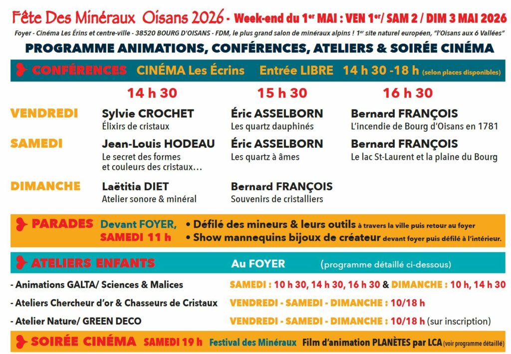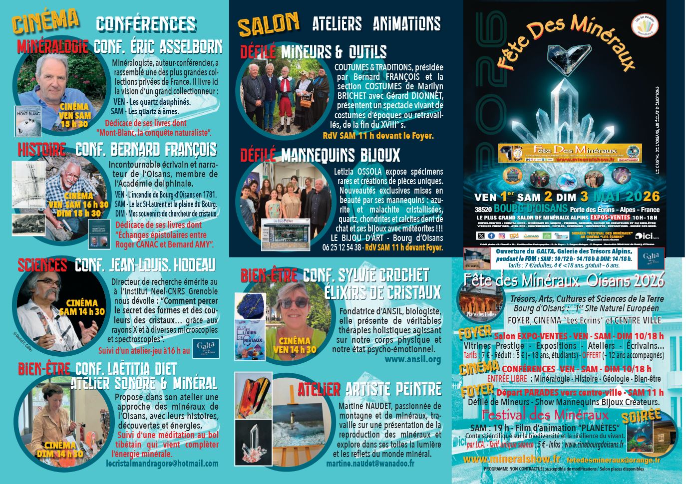 Les conférences CONFERENCES en journée au CINEMA LES ECRINS: ENTREE LIBRE 10h-18h, en accès libre. Selon places disponibles Les Conférences GEOLOGIQUES et HISTORIQUES Tout proche du Foyer, cet équipement haute définition permet une programmation de qualité au service des conférenciers et animateurs de la FETE DES MINERAUX. Les nombreuses conférences, par le choix des thèmes variés abordés par les scientifiques, spécialistes ou universitaires, permettront à chacun d’y trouver un centre d’intérêt (programme ci-dessous et au salon). Les conférenciers sont pour la plupart, présents sur leur stand au salon et dédicacent leurs ouvrages. FESTIVAL DES MINERAUX en soirée Cinéma Les Ecrins, FILMS sélectionnés par la FDM les vendredi et samedi en soirée Programme FDM 2025 ci-dessous/+ INFOS Cinéma LCA: cinebourgdoisans.fr CINEMA LES ECRINS: 100 places disponibles pour assister aux conférences & ateliers. En accès libre (10h-18h). Par les intervenants du salon. Voir ci-dessous dépliant du programme conférences 2026 Les Conférences BIEN-ETRE (selon places disponibles) Les ATELIERS Bien-être avec les pierres /CINEMA entrée libre Des animations et conférences pratiques seront proposées par des intervenants locaux au CINEMA en matinées… Pour une séance bien-être avec les pierres, les cristaux… Comment les choisir, les reconnaitre, leurs énergies… Ou plongez dans un bain de relaxation profonde avec les bols chantants, profitez de ces moments de détente ! Les thérapeutes sont aussi sur leurs stands au salon pour vous proposer ateliers et conseils personnalisés (Egalement sur RDV). Programme 2026: AU CINEMA : Entrée libre (10h/18h)/ Selon places disponibles CONFERENCES historiques, scientifiques & géologiques & ATELIERS bien-être Programme 2026 ci-dessous: